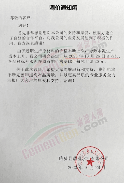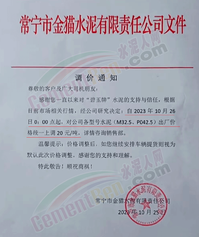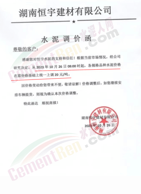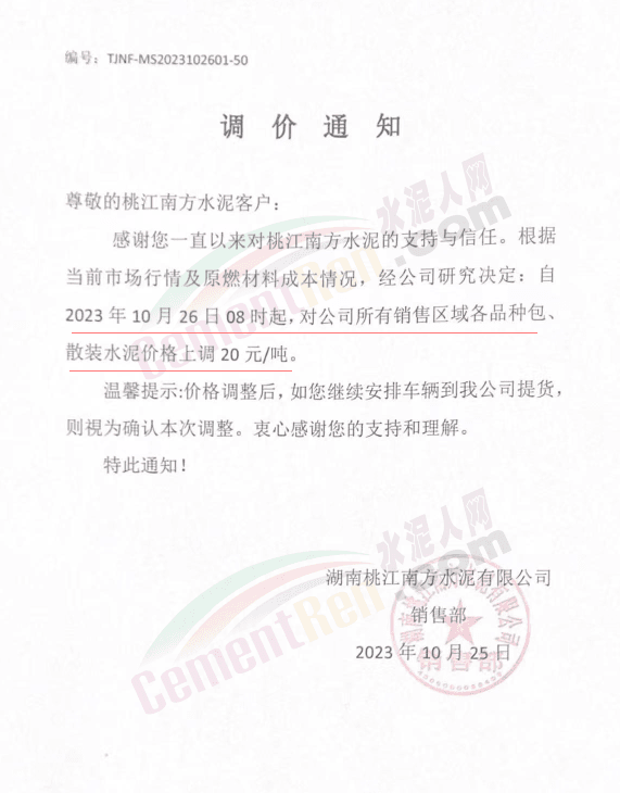 近來受原材料價格上漲和經(jīng)濟政策的刺激,廣東、湖南、山西、陜西多地包括海螺水泥在內(nèi)的多家品牌企業(yè)通知上調(diào)報價。廣東東莞鵬潤建材有限公司通知,根據(jù)目前的市場情況,從10月26日8時起公司供應的海螺全品項散裝水泥上調(diào)20元/噸。