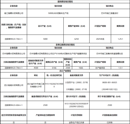 巴中海螺水泥有限責任公司原備案核準設計產能為4500噸,置換后總產能為6166t/d,置換指標產能為2500t/d,置換產能1666t/d。