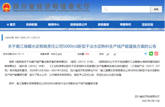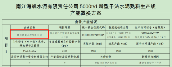 據查,早在2021年1月11日,四川省經信廳網站曾發布南江海螺水泥5000t/d新型干法熟料生產線產能置換項目方案,將退出四川南威水泥2500t/d、四川成實天鷹水泥2500t/d、四川峨眉山西南水泥嘉華分公司2000t/d三條生產線,減量置換建設一條5000t/d生產線。