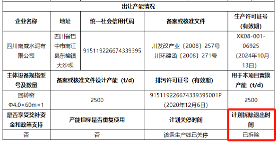 本次置換方案中,出讓方四川南威水泥有限公司生產許可證有效期至2024年10月13日,排污許可證有效期至2020年12月6日,截至本次變更方案公示,四川南威水泥有限公司生產許可證已過期5個月,排污許可證過期已超過4年。