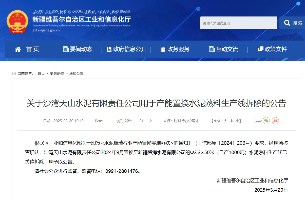 根據《工業和信息化部關于印發<水泥玻璃行業產能置換實施辦法>的通知》(工信部原〔2024〕206號)要求,經現場核查確認,沙灣天山水泥有限責任公司2024年9月置換至新疆博海水泥有限公司的Φ3.3×50米(日產1000噸)水泥熟料生產線已關停拆除,現予以公告。