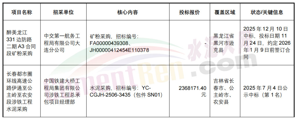盡管存在質量隱患,四平佳潤的產品仍成功打入東北重大工程供應鏈,銷售網絡覆蓋吉林、黑龍江核心區域。招投標信息顯示,2025年11月,企業憑借“大連分-醉美龍江331項目-公開招標-礦粉”項目中標,約定于2026年1月9日前與中交第一航務工程局有限公司簽訂合同,供貨至黑龍江省黑河市遜克縣醉美龍江331項目部,該項目為邊防路重點工程,對建材質量有嚴格要求。