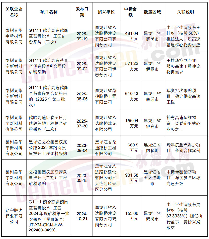 企業股權結構呈現三足鼎立格局,王桂華、賈樹華、姜瑤各持股33.33%左右,姜瑤擔任執行董事兼總經理,王桂華任監事。其關聯企業布局已滲透東北建材產業鏈,實際控制人王桂華控股50%的梨樹縣華宇新材料有限公司,2025年在黑龍江省多項高速公路礦粉采購項目中中標,中標金額累計超2000萬元;股東賈樹華則掌控遼寧鵬達鈣業等四家企業,業務覆蓋鈣業加工、建材貿易等領域,形成跨區域關聯經營網絡。